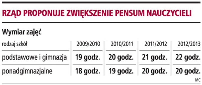 Od roku szkolnego 2009/2010 przez cztery kolejne lata wymiar obowiązkowych zajęć prowadzonych przez nauczycieli podstawówek i gimnazjów będzie wzrastał o jedną godzinę. W przyszłym roku wyniesie więc 19 godz., a w 2012 roku 22 godziny. Z kolei pensum nauczycieli szkół ponadgimnzjalnych wzrośnie o jedną godzinę od roku szkolnego 2010/2011 i kolejną od września 2011 r. Ich wymiar czasu pracy w ciągu trzech najbliższych lat zwiększy się więc o 2 godziny. Tak wynika z najnowszej wersji rządowego projektu nowelizacji Karty Nauczyciela, która powtórnie trafi do konsultacji społecznych.