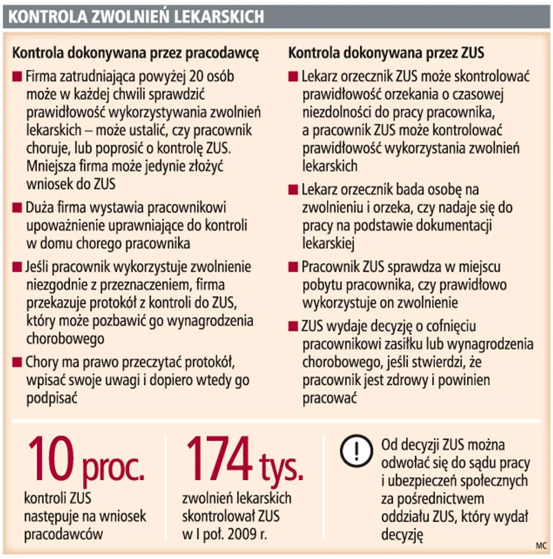 ZUS w sierpniu 2009 r. skontrolował rekordową liczbę osób na zwolnieniach. Lekarze orzecznicy ZUS przeprowadzili 21,5 tys. badań osób posiadających zaświadczenie o czasowej niezdolności do pracy. Ponadto pracownicy Zakładu w ramach kontroli prawidłowości wykorzystania zwolnień lekarskich skontrolowali 11,6 tys. osób. Łącznie ZUS w sierpniu przeprowadził 33,1 tys. kontroli. To więcej o 12,5 proc. niż w poprzednich miesiącach. Średnia miesięczna liczba kontroli w ciągu I półrocza 2009 r. wyniosła 29 tys., łącznie w ciągu pierwszych sześciu miesięcy tego roku ZUS przeprowadził 174 tys. kontroli.