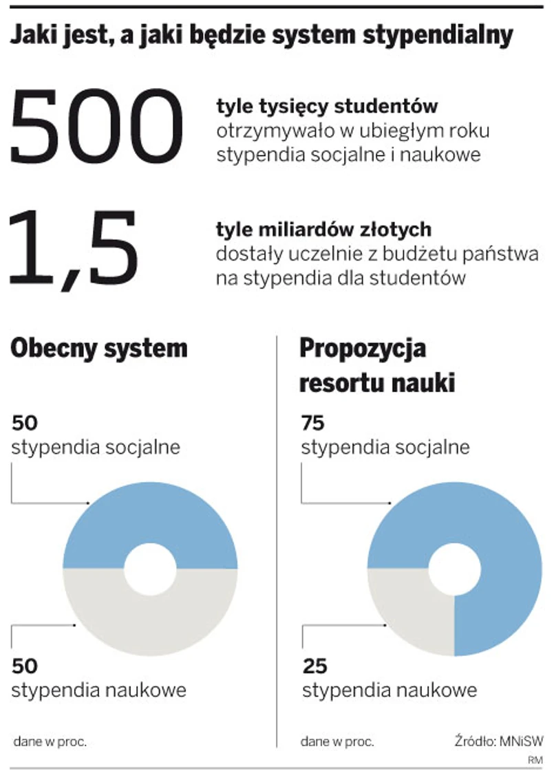 W całej Polsce stypendia otrzymywało w zeszłym roku ponad 500 tys. studentów . Uczelnie wyższe dostały na ten cel z budżetu państwa 1,5 mld zł. Połowa tej sumy poszła do studentów w ramach pomocy socjalnej, a druga jako stypendia naukowe. Resort nauki chce zmienić proporcje wydawania funduszy: od przyszłego roku 75 proc. pieniędzy na stypendia ma być przekazywane na fundusz pomocy materialnej dla studentów , a tylko 25 proc. na stypendia za dobre wyniki w nauce. Chodzi o to, by pula pieniędzy na stypendia socjalne została zwiększona w ramach tych samych środków budżetowych.