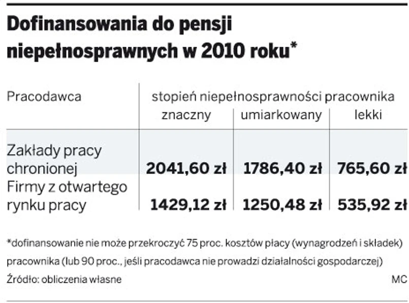 Resort pracy chce także, aby w przyszłym roku wysokość dopłat dla wszystkich niepełnosprawnych pracowników była obliczana na podstawie płacy minimalnej z 2009 roku (1276 zł), a nie – jak przewidują obecnie obowiązujące przepisy – z 2010 roku (1317 zł). Pomoc wypłacana firmom nie będzie więc wyższa o 3,2 proc.