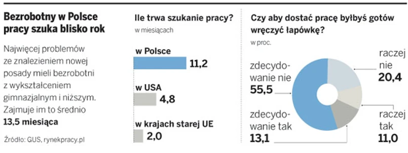 Jak bardzo zdesperowani są bezrobotni Polacy, pokazuje sondaż przeprowadzony kilka dni temu przez portal internetowy Rynekpracy.pl. Jego wyniki były zaskakujące. Na pytanie: Czy wręczyłbyś łapówkę w zamian za pracę, aż jedna czwarta ankietowanych odpowiedziała, że tak. – Praca w Polsce jest nadal dobrem deficytowym, stąd takie desperackie odpowiedzi. Do wręczenia łapówek dodatkowo skłaniałoby Polaków to, że poszukiwanie zajęcia trwa u nas tak ogromnie długo – komentuje sondaż Jeremi Mordasewicz.