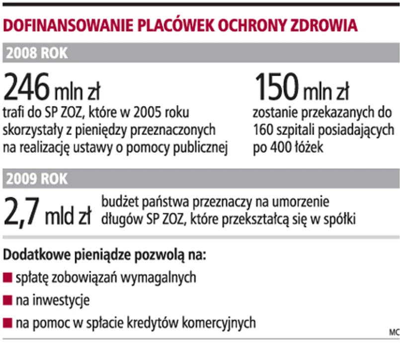Największą pomocą dla zadłużonych szpitali ma być umorzenie w przyszłym roku ich zobowiązań publicznoprawnych. Budżet zamierza przeznaczyć na ten cel 2,7 mld zł. Uzyskanie dodatkowych środków ma być uzależnione od tego, czy SP ZOZ przekształci się w spółkę prawa handlowego.