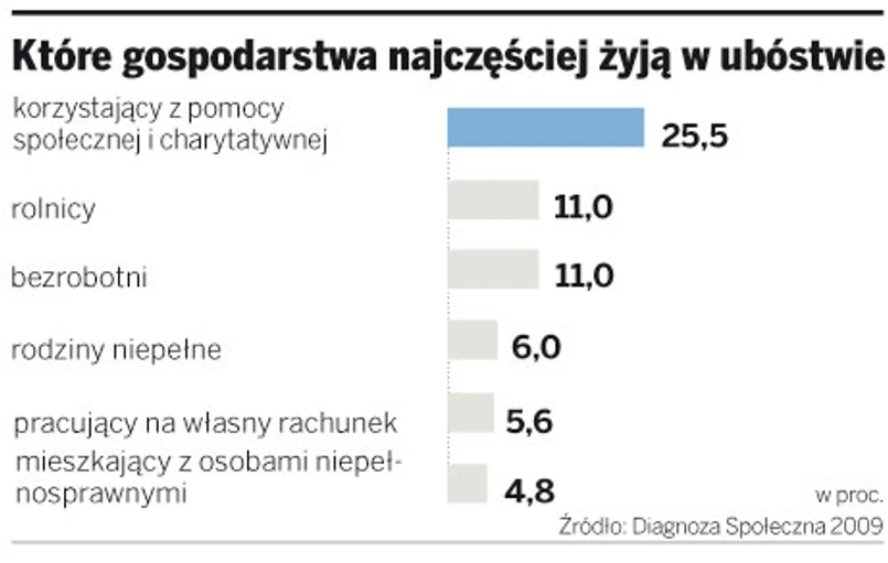 A jeśli trafią do właściwych osób? Zasiłki, jakie dostają rodziny naprawdę biedne, nie wystarczają na podstawowe potrzeby. Coraz częściej również praca zarobkowa nie wystarcza, by wyrwać się z biedy. – Zajmowaliśmy się rodziną, w której było dziesięcioro dzieci. Opiekowała się nimi matka, a ojciec pracował. Zarabiał nawet całkiem nieźle, bo około 2 tys. zł. Jednak po opłaceniu rachunków często nie wystarczało im na jedzenie czy ubranie. Zdarzało się, że matka zwalniała dzieci ze szkoły, by szły do lasu zbierać owoce, i je sprzedawali. Ci ludzie dostali pralkę z opieki społecznej, ale gdy się zepsuła, nie było ich stać na naprawę – opowiada Roman Górecki, prezes stowarzyszenia „Nasze gniazdo”.