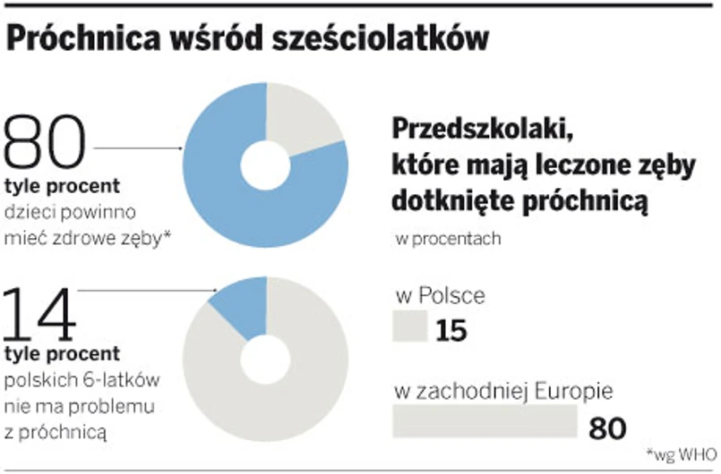 Stan uzębienia polskich dzieci jest od lat na najniższym poziomie nie tylko w Europie, ale i na świecie. Na spotkaniu u rzecznika praw dziecka Marka Michalaka konsultant krajowy w dziedzinie stomatologii dziecięcej prof. Barbara Adamowicz-Klepalska przedstawiała wyniki badań z 2008 roku. Okazuje się, że 85,4 proc. 6-latków, 94 proc. 15-latków i 96 proc. 18-latków cierpi na próchnicę. Z tego powodu co dziesiąty badany 15-latek miał usunięty co najmniej jeden stały ząb.