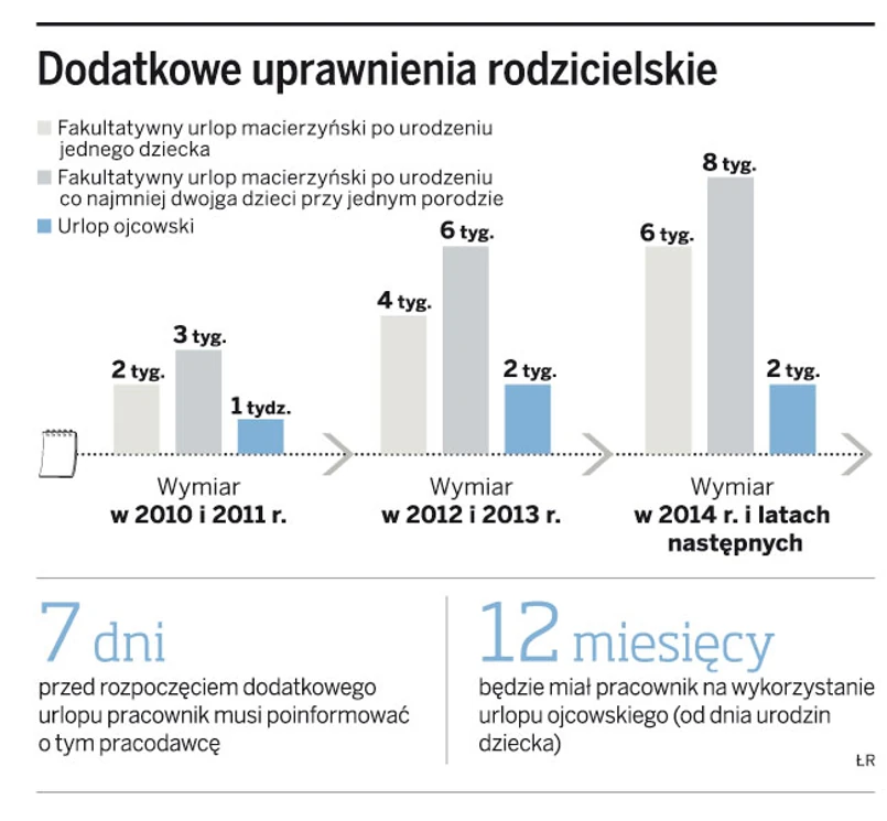 Z kolei ojcowie od nowego roku uzyskają prawo do jednego tygodnia urlopu ojcowskiego. Wbrew obiegowym opiniom będą mogli z niego skorzystać także ojcowie dzieci urodzonych w tym roku. To około 300 tys. osób. Można szacować, że tylu spośród około 440 tys. tegorocznych ojców jest zatrudnionych na etacie. Wyjątkowo prawo to nie będzie przysługiwać tylko tym mężczyznom, których dzieci urodziły się w ciągu pierwszych siedmiu dni 2009 r. Aby skorzystać z dodatkowych uprawnień, rodzice będą musieli złożyć wniosek w tej sprawie. Pracodawca nie musi ich informować o przysługujących im nowych prawach.