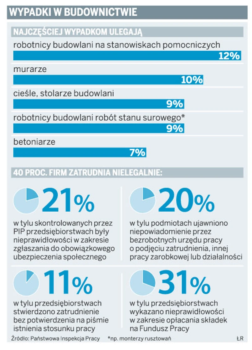 W I półroczu 2009 r. liczba poszkodowanych w wypadkach przy pracy w budownictwie spadła o 20 proc. w stosunku do analogicznego okresu roku poprzedniego. Zmniejszyła się też o 16 proc. liczba osób z ciężkimi obrażeniami ciała oraz o 22 proc. liczba ofiar śmiertelnych. Zdaniem Danuty Koradeckiej, dyrektora Centralnego Instytutu Ochrony Pracy – Państwowego Instytutu Badawczego, statystyki nie pokazują faktycznego stanu bezpieczeństwa pracy.
