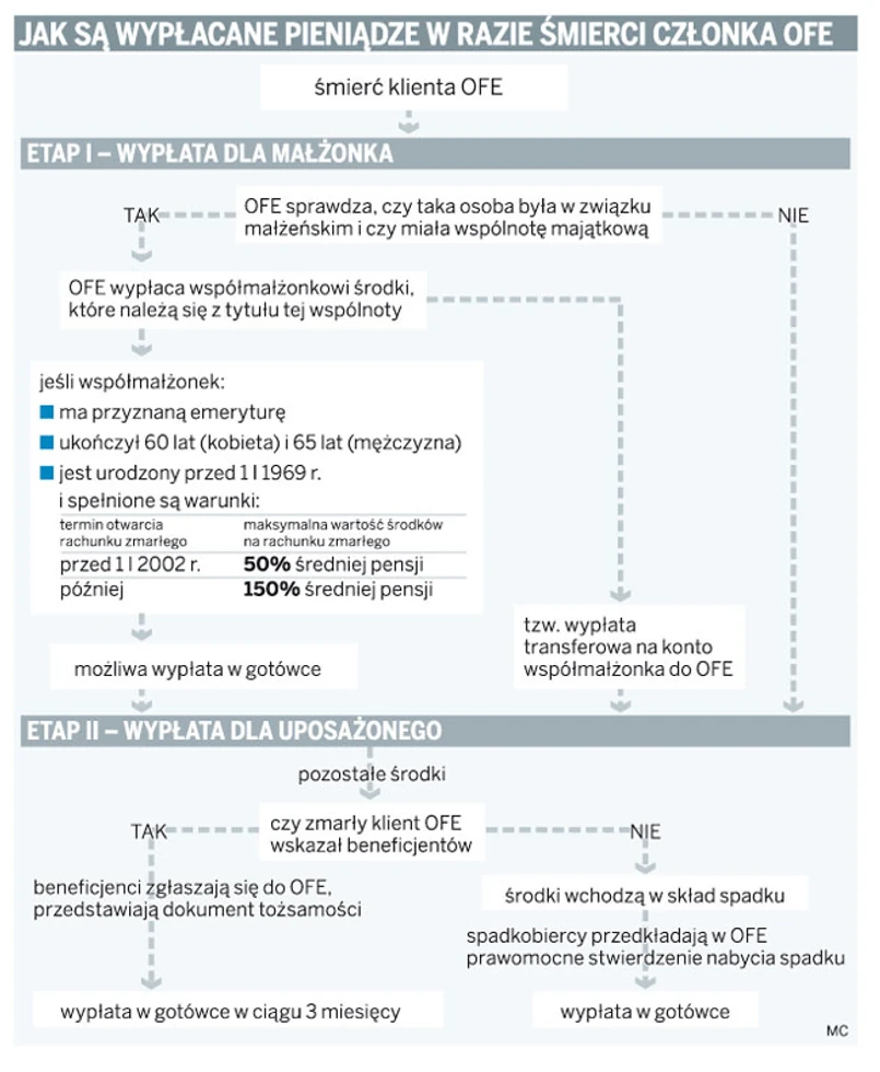 W razie śmierci klienta OFE bierze pod uwagę, ile pieniędzy należy się małżonkowi. Nie wypłaca ich jednak w gotówce, ale przekazuje (poza wyjątkami – patrz grafika) na konto małżonka do II filaru.