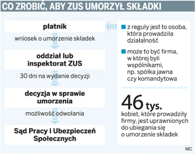 Zasady umorzenia są różne. Matki przebywające na macierzyńskim mogą ubiegać się o zwrot zapłaconych składek i odsetek. Jeśli obecnie prowadzą działalność, to zostaną one zaliczone im na poczet zaległych, bieżących i przyszłych płatności. Osoby na urlopie wychowawczym mogą otrzymać tylko odsetki.