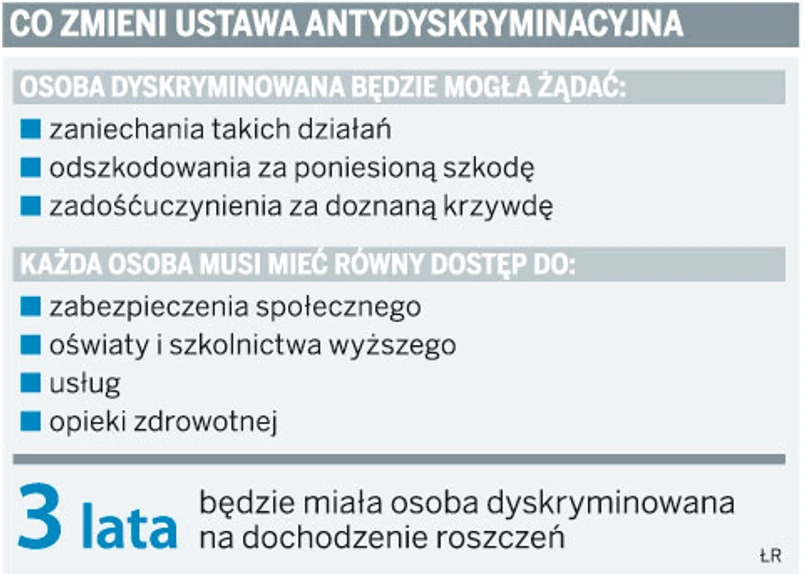 Osoby, które uznają, że dyskryminuje ich np. promocja handlowa, reklama, odmowa najmu mieszkania, zasady rekrutacji do szkół lub dostępu do opieki medycznej, będą mogły żądać zaniechania takich działań lub zadośćuczynienia. Jeżeli z tego powodu poniosą szkodę (np. osoba niepełnosprawna przyjedzie na własny koszt do masażysty, który odmówi usługi), będą mogły się starać o odszkodowanie. Tak wynika z ostatecznej wersji rządowego projektu ustawy w sprawie wdrożenia niektórych przepisów Unii Europejskiej w zakresie równego traktowania. Teraz trafi ona pod obrady Rady Ministrów. Musi być uchwalona szybko, bo ponagla nas w tej sprawie Komisja Europejska.