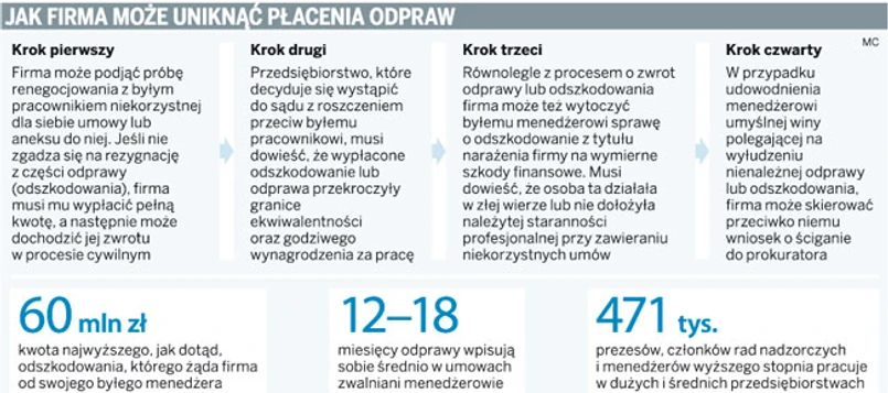 Zwalniani prezesi i menedżerowie zwiększają przed odejściem wysokość odpraw. Straty finansowe firm wynikające z działań zwalnianych menedżerów sięgają setek milionów zł. Firmy próbują zmienić niekorzystne zapisy i wytaczają byłym zarządzającym procesy.