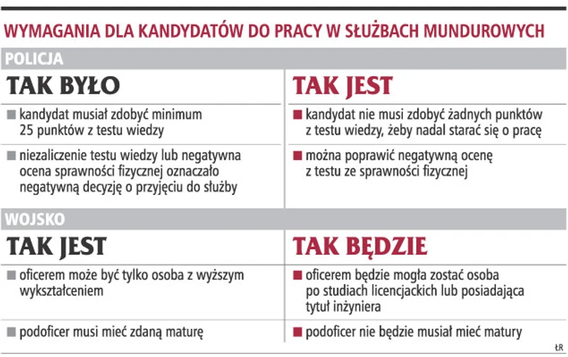 Kandydat do pracy w policji nie musi mieć wiedzy ogólnej, by przejść do kolejnego etapu rekrutacji. O przyjęcie do korpusu oficerów w wojsku będą mogły się ubiegać osoby po studiach licencjackich. Mimo obniżenia wymagań policja nadal poszukuje osób do pracy.