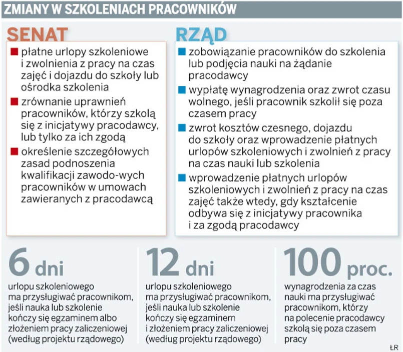 Zarówno senacki, jak i rządowy projekt nowelizacji kodeksu pracy jest korzystny dla pracowników. Pierwszy z nich oprócz płatnych zwolnień z pracy i urlopów szkoleniowych (np. sześć dni dla pracownika przystępującego do egzaminu maturalnego lub zawodowego) przewiduje też wprowadzenie zasady, zgodnie z którą uprawnienia takie przysługują nie tylko pracownikom skierowanym na szkolenie przez pracodawcę, ale także tym, którzy z własnej inicjatywy podejmują szkolenie (ale za zgodą firmy). Szczegółowe zasady podwyższania kwalifikacji zawodowych pracowników ma określić umowa zawierana z pracodawcą.