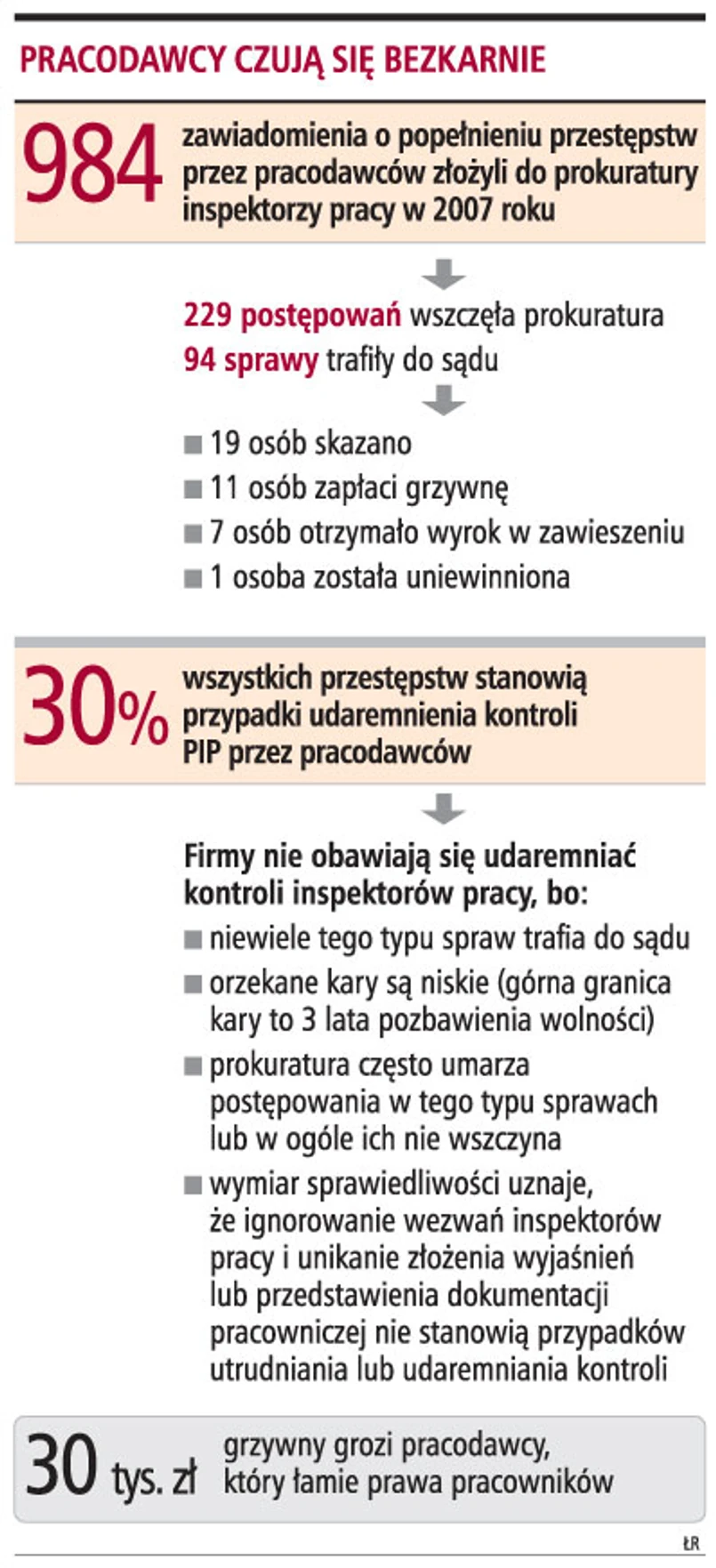 Prokuratura wnosi akty oskarżenia przeciw firmom tylko w 10 proc. spraw skierowanych do niej przez inspektorów pracy. Sądy orzekają niskie kary, choć górna granica sankcji to trzy lata pozbawienia wolności. Pracodawcy czują się bezkarni, bo ignorowanie wezwań inspektorów pracy nie jest przestępstwem.
