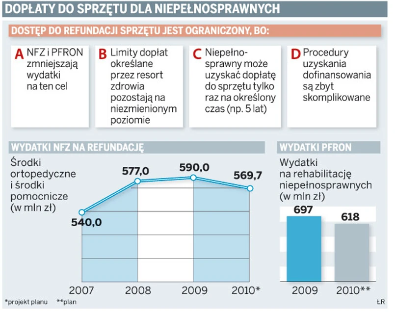 Wydatki NFZ na refundację wózków czy protez są za niskie do potrzeb niepełnosprawnych. Niepełnosprawni chcą uproszczenia procedur uzyskiwania refundacji z NFZ na zakup sprzętu. W 2010 roku mniej osób uzyska dofinansowanie na zakup sprzętu rehabilitacyjnego z PFRON.