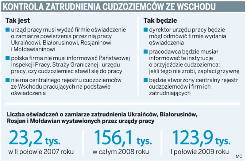 Ministerstwo Pracy i Polityki Społecznej (MPiPS) chce wprowadzić monitoring zatrudniania obcokrajowców ze Wschodu: Ukraińców, Białorusinów, Rosjan i Mołdawian. Dzięki niemu Państwowa Inspekcja Pracy (PIP) i Straż Graniczna (SG) łatwiej i szybciej ustalą, ilu z nich pracuje legalnie, a ilu na czarno. Będzie też wiadomo, ilu z nich nielegalnie, po uzyskaniu polskiej