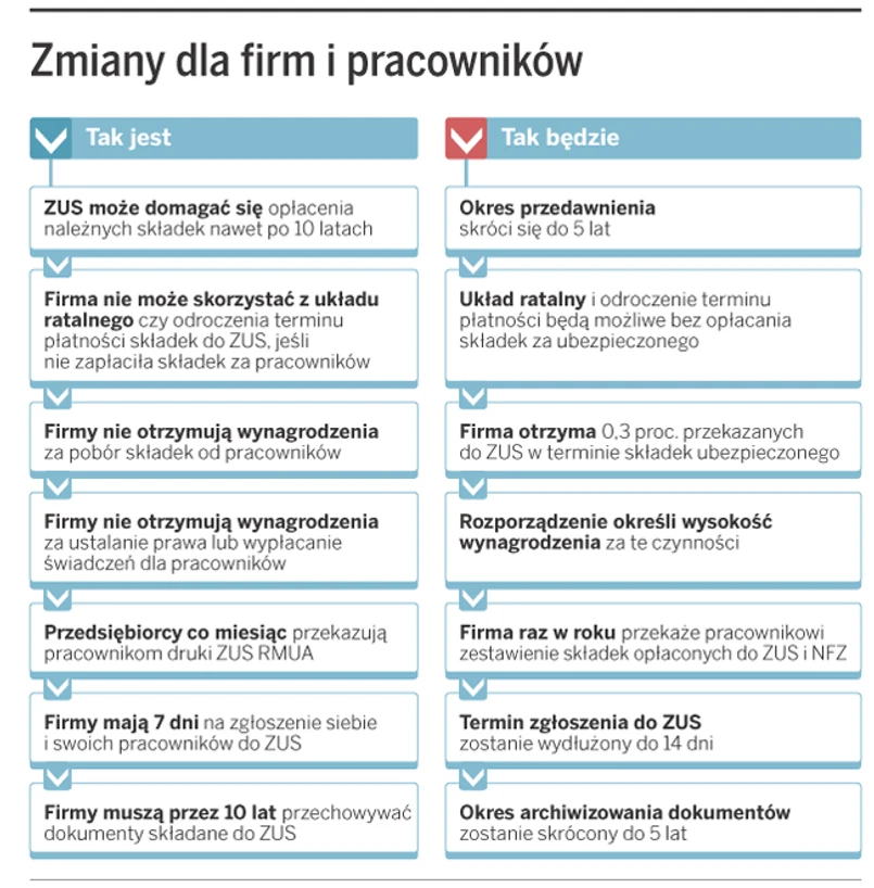 Należności firm wobec ZUS będą się przedawniać po pięciu, a nie po 10 latach. Pracownicy nie otrzymają druku ZUS RMUA co miesiąc, a tylko raz w roku. Firmy zyskają prawo do układu ratalnego w ZUS, nawet gdy nie zapłacą za pracownika składek.