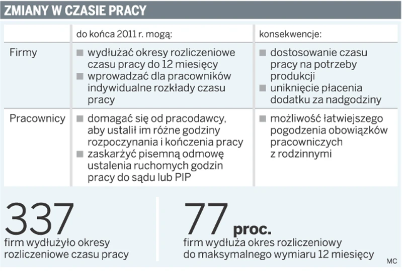 Od 22 sierpnia do 14 grudnia tego roku 337 przedsiębiorstw zawarło z pracownikami porozumienie w sprawie wydłużenia okresów rozliczeniowych czasu pracy. Dzięki temu firmy mogą zwiększać lub zmniejszać wymiar czasu pracy podwładnych w zależności od potrzeb produkcji. Rzadziej lub później zapłacą im też za nadgodziny. Wprowadzanie takich rozwiązań umożliwiła firmom ustawa antykryzysowa, która będzie obowiązywać do końca 2011 roku. Mogą z nich skorzystać wszyscy pracodawcy, którzy posiadają status przedsiębiorcy, a nie tylko ci, którzy zanotowali straty z powodu kryzysu.