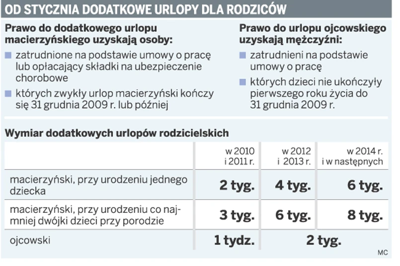 Od 1 stycznia pracownikom będzie przysługiwać dodatkowy urlop macierzyński i urlop ojcowski. Istnieje jednak ryzyko, że nie wszyscy rodzice skorzystają z nowych uprawnień. Wszystko przez niejasne przepisy nowelizacji kodeksu pracy, które nie wskazują, jak należy stosować nowe uprawnienia pracownicze na przełomie 2009 i 2010 r.
