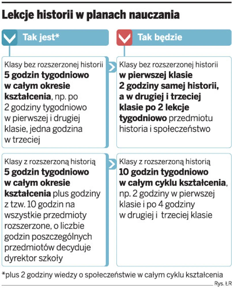 – Planujemy, że w pierwszej klasie będą dwie godziny historii i jedna godzina wiedzy o społeczeństwie, a w drugiej i trzeciej po dwie godziny tygodniowo, ale w bloku, gdzie historia uzupełniona będzie elementami wiedzy o społeczeństwie, kulturze, gospodarce czy filozofii – mówi Grzegorz Żurawski, rzecznik prasowy ministra edukacji narodowej.