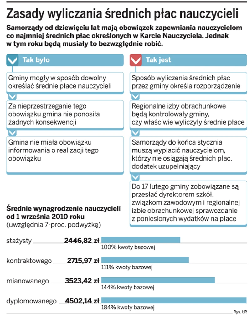 Do tej pory, mimo że obowiązek zapewniania średnich nałożony jest na gminy od dziewięciu lat, to ze względu na brak realnych sankcji za niewywiązywanie się z niego, większość gmin dowolnie wyliczała te pensje. Nowelizacja Karty Nauczyciela (KN) spowodowała jednak, że w tym roku muszą sporządzić analizę, wyliczyć średnią zgodnie z rozporządzeniem, a w razie zaniżania płac – wypłacić dodatek uzupełniający.