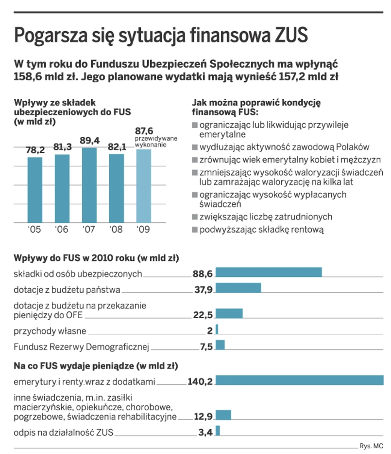 W 2010 roku wydatki FUS będą wyższe o 68,6 mld zł od wpływów ze składek. Ze składek wpłynie 86,8 mld zł, a wydatki wyniosą 157,2 mld zł. ZUS zakłada, sporządzając plan finansowy, że zatrudnionych będzie o 1 proc. mniej niż w 2009 roku, a przeciętne wynagrodzenie w gospodarce narodowej wyniesie 3146 zł (o dwa proc. wyższe niż w 2009 roku). ZUS prognozuje też, że w 2010 roku świadczenia emerytalno-rentowe będzie pobierać średnio 7,4 mln osób, tj. o 1,2 proc. mniej niż w 2009 roku.