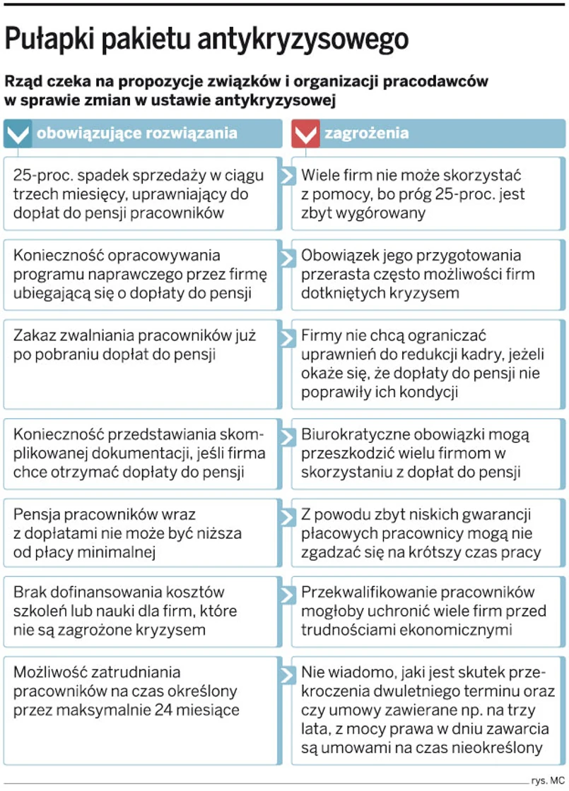 Jak ustalił DGP, największe szanse na uchwalenie mają propozycje dotyczące złagodzenia warunków, jakie muszą spełnić firmy, które chcą ubiegać się o dopłaty do pensji pracowników. Większość organizacji pracodawców i centrali związkowych chce też zmienić zasady zatrudnienia na czas określony. Obecne przepisy nie precyzują, kiedy i czy w ogóle umowy takie przekształcają się w stałe kontrakty.