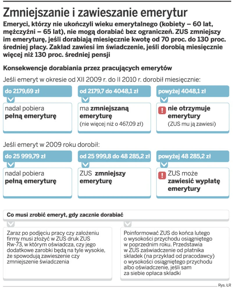 Pozostali młodsi dorabiający emeryci, tzn. ci, którzy nie prowadzą biznesu, ale zarabiają na etacie, nie mogą dorabiać, ile chcą. ZUS zmniejsza lub zawiesza ich świadczenie, jeśli osiągną dodatkowy przychód przekraczający 70 proc. średniej płacy. Jeśli dorobią ponad 130 proc. tej wartości, ZUS w ogóle zawiesza wypłatę. Szczególne rozwiązanie dotyczy osób, które mają prawo do emerytury pomostowej i wykonują pracę w szczególnych warunkach lub o szczególnym charakterze. Jeśli takie osoby dorabiają, to ZUS zawiesza im wypłatę świadczenia bez względu na wysokość zarobku.