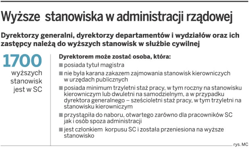 Tymczasem do końca marca tego roku otwarty nabór powinien być przeprowadzony na ponad 150 stanowiskach wyższych, które obecnie zajmują osoby niespełniające ustawowych kryteriów. Część członków Rady Służby Cywilnej uważa więc, że konkurencyjny nabór stał się fikcją. Dyrektorzy generalni zamiast go przeprowadzać wolą przenosić na określone stanowisko już zatrudnionych pracowników.