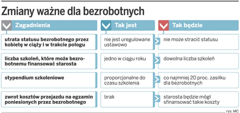 W projektowanych przepisach o szkoleniach proponuje się traktowanie w jednakowy sposób podjęcia zatrudnienia, innej pracy zarobkowej i, co jest nowością, działalności gospodarczej. Skierowany na szkolenie przez starostę bezrobotny będzie więc miał prawo do jego ukończenia bez konieczności ponoszenia kosztów szkolenia za okres, w którym podjął działalność gospodarczą. Bezrobotnemu, który podejmie w trakcie szkolenia działalność gospodarczą albo zatrudnienie (jak dotychczas), będzie przysługiwać stypendium w wysokości 20 proc. zasiłku, od ostatniego dnia miesiąca, w którym podjął zatrudnienie czy działalność gospodarczą do zakończenia szkolenia. Od stypendium tego nie są odprowadzane składki na ubezpieczenia społeczne.