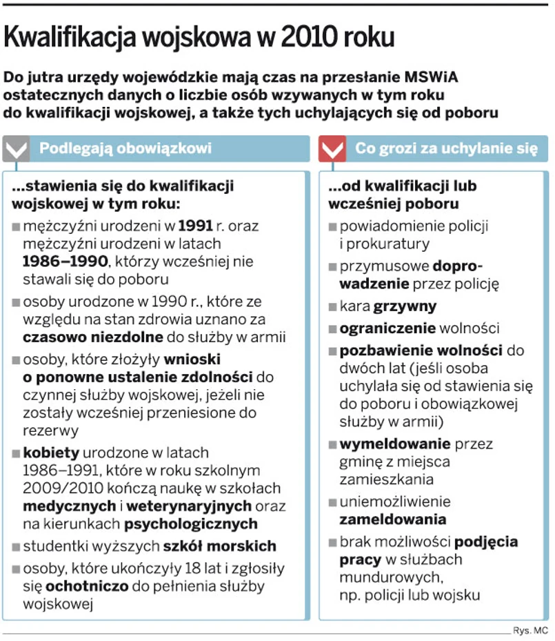 Niedoszłych poborowych, którzy nie wywiązali się z obowiązku przystąpienia do poboru lub kwalifikacji, jest kilkanaście tysięcy. Na przykład w województwie świętokrzyskim jest ich około jednego tysiąca, w łódzkim – 1,7 tys., a w mazowieckim ponad 2,8 tys.