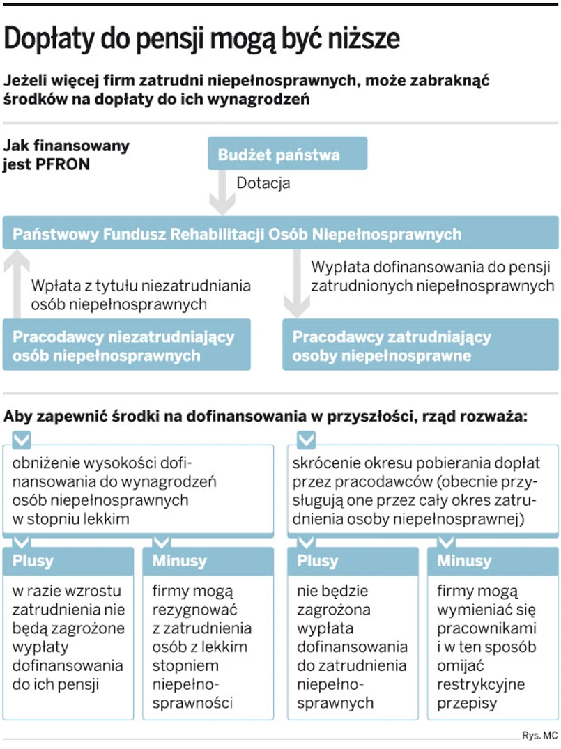 Z powodu wzrostu zatrudnienia osób niepełnosprawnych może zabraknąć pieniędzy na dofinansowania do ich pensji. Aby ratować finanse Państwowego Funduszu Rehabilitacji Osób Niepełnosprawnych (PFRON), rząd rozważa obniżenie wysokości dofinansowania do wynagrodzeń osób z lekkim stopniem niepełnosprawności albo skrócenie czasu pobierania dopłat do pensji (obecnie przysługują one przez cały okres zatrudnienia osoby niepełnosprawnej).