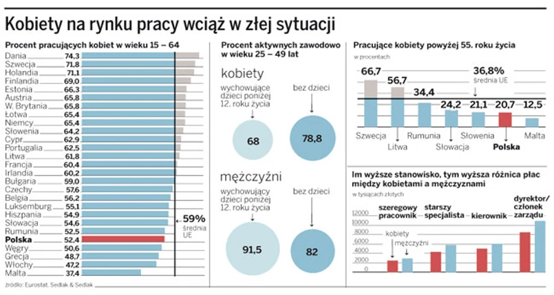 Polka wciąż ma znacznie gorszą sytuację na rynku pracy niż przeciętna Europejka. Znacznie częściej jest bezrobotna i trudniej jej łączyć pracę z wychowywaniem dzieci. Na dodatek pensje Polek są o prawie jedną szóstą mniejsze niż zarobki mężczyzn – wynika z najnowszego raportu Komisji Europejskiej o równości kobiet i mężczyzn, do którego dotarł DGP.
