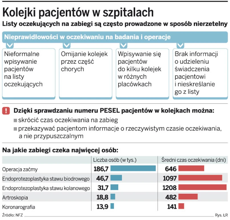 Część szpitali, mimo obowiązku, w ogóle nie prowadzi list osób oczekujących na zabiegi. Tam, gdzie NFZ sprawdza numer PESEL oczekujących pacjentów, kolejki są krótsze. Najwięcej osób czeka na usunięcie zaćmy oraz wstawienie protezy stawu biodrowego.
