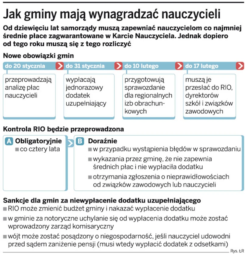 Dodaje, że jeśli sprawozdanie będzie poprawnie wypełnione, a wyrównanie wypłacone w pełnej wysokości, samorząd zostanie w tym zakresie skontrolowany dopiero przy kompleksowej kontroli przeprowadzanej co cztery lata. RIO zapowiada też kontrole doraźne – po tym jak otrzyma powiadomienie o nieprawidłowościach od nauczycieli, dyrektorów szkół czy oświatowych związków zawodowych. Te ostatnie już zapowiadają kontrole sprawozdań.