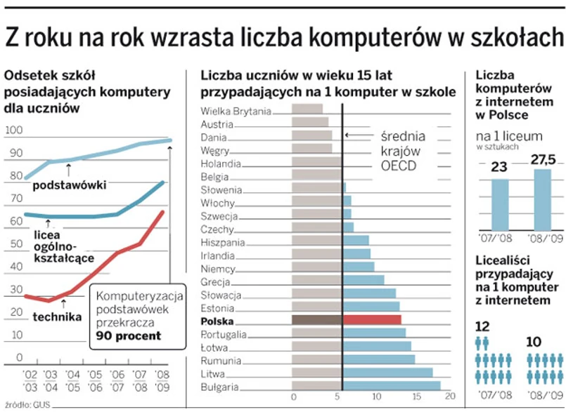 W warszawskim liceum im. Jana III Sobieskiego jest 85 komputerów na blisko pięciuset uczniów. – Wydawać by się mogło, że to całkiem sporo, ale tak naprawdę ta liczba niewiele mówi o stanie informatyzacji szkoły – mówi Wojciech Domalewski, nauczyciel informatyki i szef Stowarzyszenia Komputer w Szkole. – Internet obsługujący wszystkie komputery ma taką samą przepustowość, jak moja domowa sieć, którą mam do obsługi tylko jednego komputera. A dzieciaki z komputerów korzystają głównie na lekcjach informatyki, czyli przez dwie, góra trzy godziny tygodniowo. Ciężko taki stan nazwać informatyzacją szkoły – dodaje Domalewski.