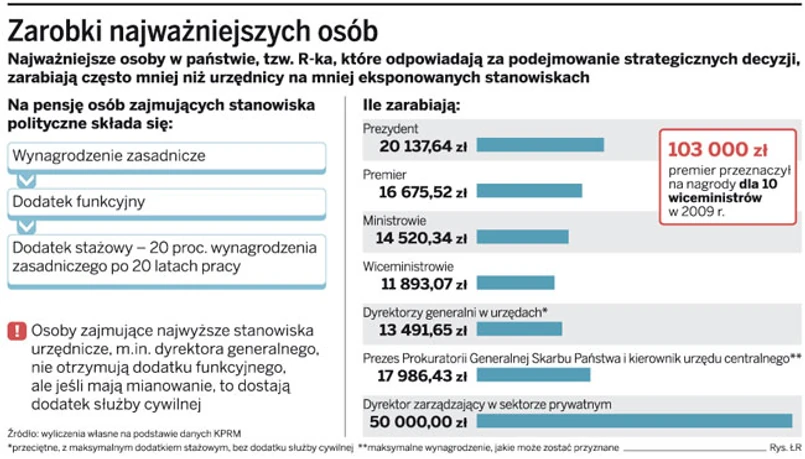 Zdarza się też, że dyrektor departamentu w ministerstwie zarabia więcej niż wiceminister. Zgodnie z rozporządzeniem o wynagrodzeniach członków służby cywilnej wynagrodzenie zasadnicze na takim stanowisku może wynosić maksymalnie 15 tys. zł brutto, a minimalnie 4,2 tys. zł. Z danych KPRM wynika, że w ministerstwach wynosi ono 10 tys. zł. Do tego trzeba doliczyć m.in.: premie, trzynastą pensję, dodatek stażowy. Pracownicy służby cywilnej mogą też zasiadać odpłatnie w różnego rodzaju komisjach, zespołach czy radach nadzorczych.
