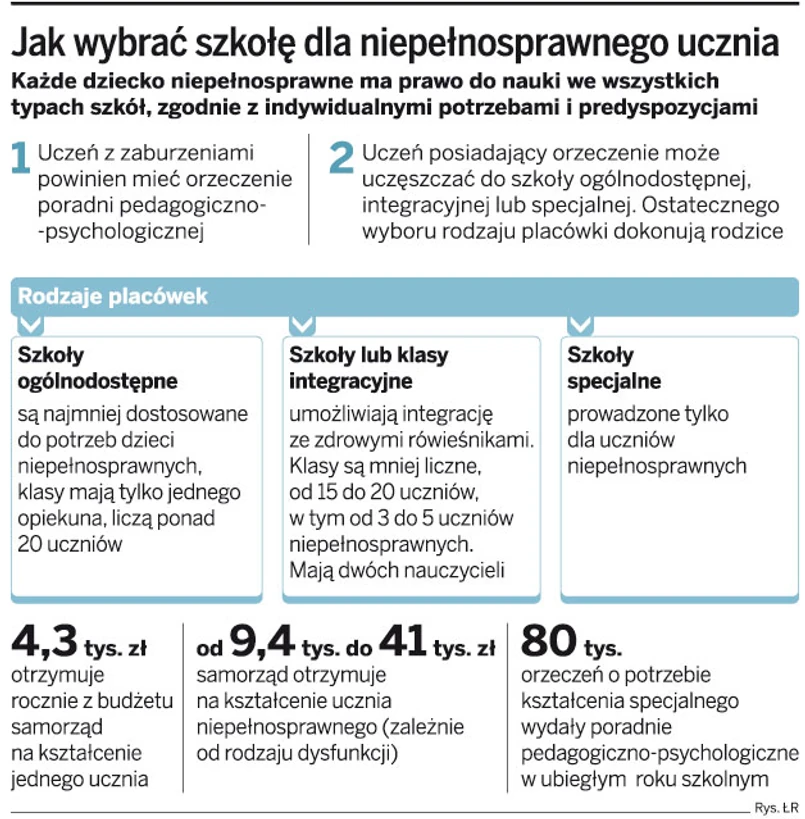 Szkół i klas integracyjnych również jest za mało. Na 35 tys. działających szkół 1,5 tys. prowadzi takie klasy. Do krakowskiej SP nr 26 uczeń z orzeczeniem o kształceniu specjalnym chodził osiem miesięcy. Tak długo czekał na miejsce w placówce integracyjnej.