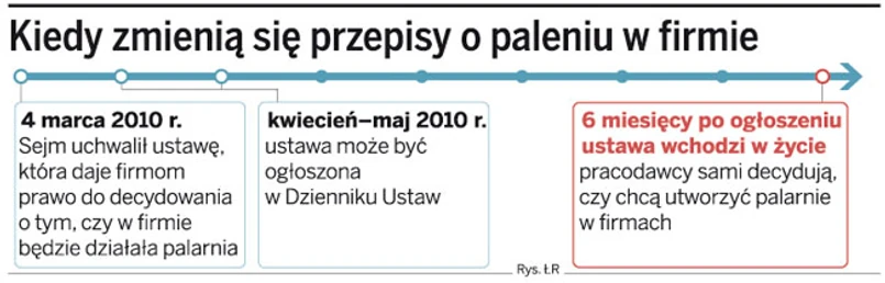 Jeszcze w tym roku w wielu firmach mogą zniknąć pomieszczenia, w których pracownicy mogą palić. Tylko od dobrej woli pracodawcy będzie zależeć, czy utworzy on takie miejsca w zakładzie pracy. Tak wynika z ustawy z 4 marca 2010 r. o zmianie ustawy o ochronie zdrowia przed następstwami używania tytoniu i wyrobów tytoniowych. Trafiła ona już do Senatu.