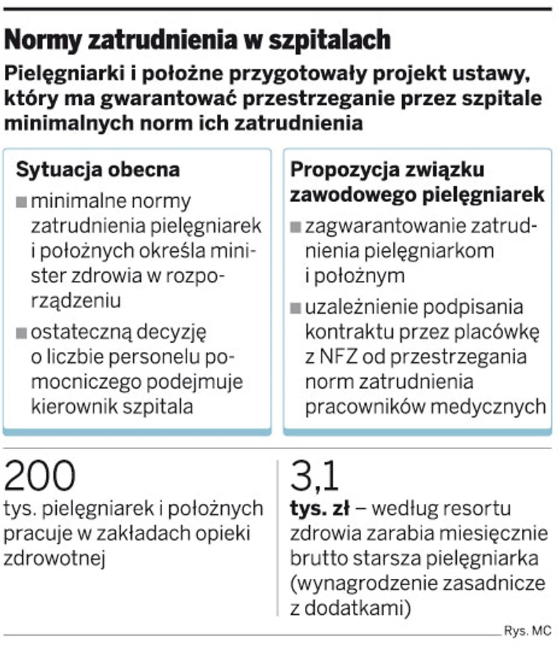 Dlatego związek zawodowy pielęgniarek i położnych przygotował własny projekt ustawy, który ma wprowadzić minimalne normy zatrudnienia pielęgniarek i położnych. Dzięki temu uzyskałyby one gwarancję zatrudnienia.