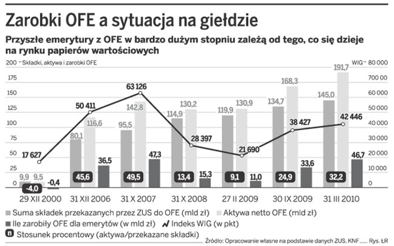 Już 145 mld zł kosztowała nas reforma emerytalna. Tyle od 1999 roku do końca marca tego roku ZUS przekazał do OFE. Jednak na rachunkach w II filarze ich klienci mają 191,7 mld zł. To o 46,7 mld zł więcej niż transfer ZUS. A rok temu – na koniec lutego, czyli w dołku giełdowej koniunktury – ten zysk wynosił zaledwie 11 mld zł. OFE zwiększyły więc w ciągu ostatnich 13 miesięcy o 35,7 mld zł zyski dla przyszłych emerytów.