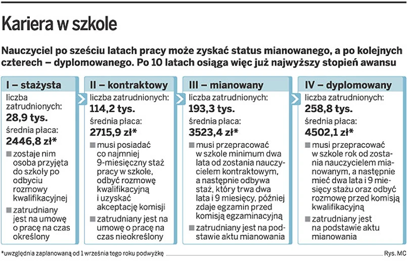 Również samorządy, które dopłacają do pensji nauczycieli i też odpowiadają za jakość kształcenia, chciałyby, aby nauczyciele w dłuższym okresie osiągali najwyższy stopień awansu. Obecnie zajmuje im to 10 lat. Później są już w praktyce nietykalni. A przez to mogą nie mieć motywacji do podnoszenia kwalifikacji i poziomu nauczania.
