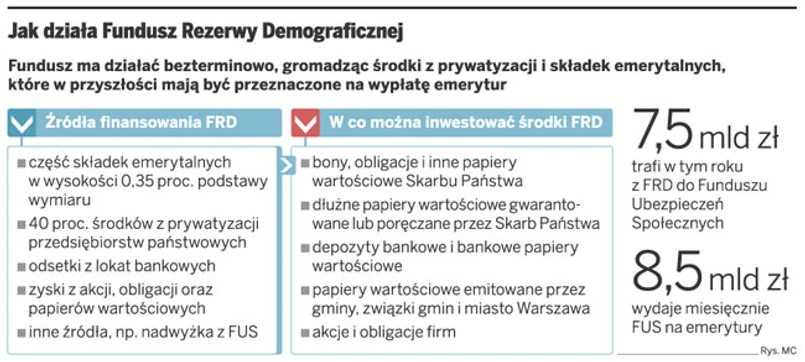 To niejedyne zastrzeżenia dotyczące funkcjonowania FRD. Twórcy reformy emerytalnej zakładali, że gromadzone tam środki mogą być wykorzystane na uzupełnienie niedoborów funduszu emerytalnego z powodów demograficznych. Rząd uznał, że jest to już konieczne. Tak stanie się w tym roku.