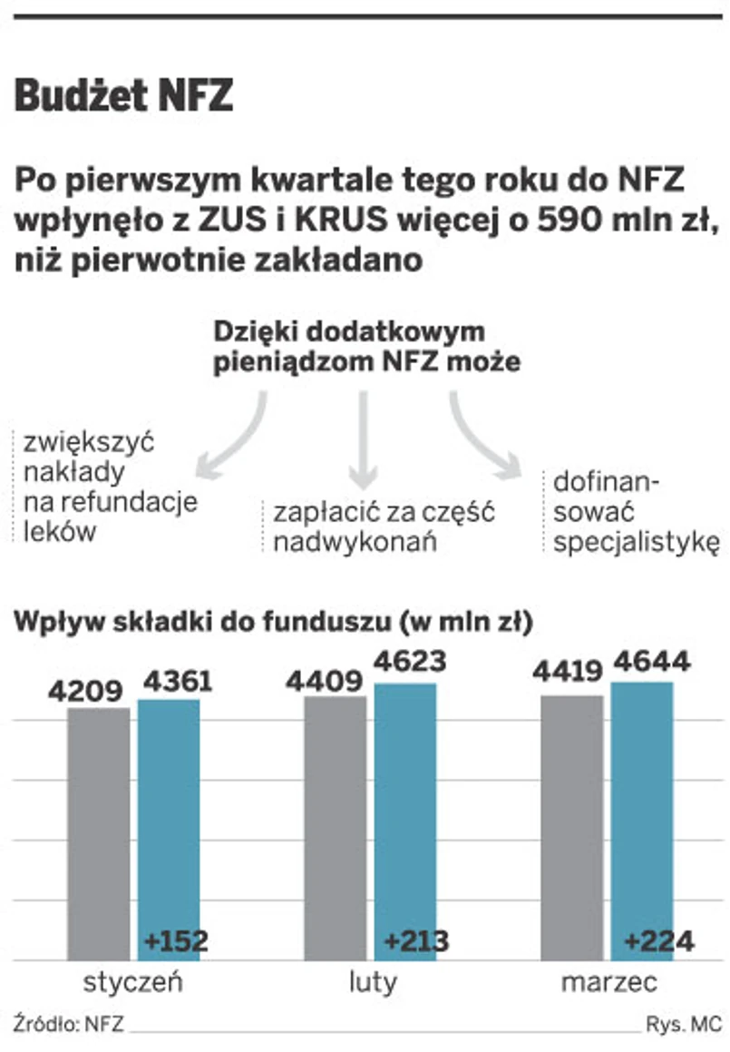 Do NFZ wpływa więcej pieniędzy, niż przewiduje to jego plan finansowy na ten rok. Tylko w I kwartale trafiło do niego dodatkowo 590 mln zł. Wszystko dzięki temu, że plan finansowy opiera się na bardzo konserwatywnych prognozach z czerwca ubiegłego roku. W międzyczasie okazało się, że mimo trudnej sytuacji gospodarczej liczba osób opłacających składkę zdrowotną nie zmalała. Dlatego utrzymały się planowane wpływy do budżetu NFZ. Co więcej, od początku roku zaczęły rosnąć. Jak nieoficjalnie dowiedział się DGP, jeżeli obecny trend utrzyma się w kolejnych miesiącach, to na koniec roku do Funduszu może wpłynąć łącznie dodatkowo 2,5 mld zł.