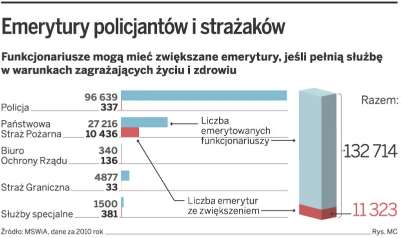 Ministerstwo Spraw Wewnętrznych i Administracji (MSWiA) specjalnie dla DGP policzyło, że co trzeci strażak pobierający już emeryturę korzysta ze zwiększenia świadczenia (patrz infografika). Natomiast z takiego przywileju korzysta niecałe 0,4 proc. emerytowanych policjantów.