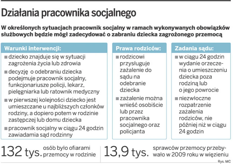 Ustawa kładzie większą rolę na działania pracownika socjalnego. Mimo protestów ze strony części rodziców posłowie zadecydowali o umożliwieniu mu szybkiej interwencji, gdy zagrożone jest dobro dziecka.