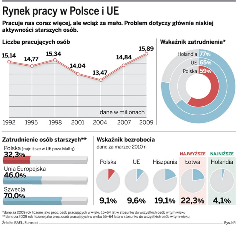 Zmorą naszego rynku pracy pozostaje m.in. bardzo niski wskaźnik zatrudnienia starszych osób. W 2009 roku wyniósł on w krajach UE dla osób w wieku 55 – 64 lata 46 proc. W Polsce to zaledwie 32,3 proc. To najgorszy (nie licząc Malty) wynik w UE. Pracuje tylko co trzecia taka osoba. W Czechach jest ich 46,8 proc., w Niemczech ponad 56 proc., a w USA ponad 60 proc.