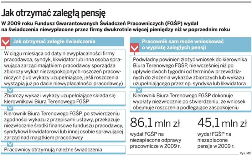 Fundusz Gwarantowanych Świadczeń Pracowniczych musiał wydać dwukrotnie więcej pieniędzy na zaspokojenie roszczeń pracowników, którzy nie otrzymywali swoich świadczeń - czyli aż 190,3 mln zł. Rok wcześniej wydał na ten cel 95,4 mln zł. Najwięcej, bo aż 86,1 mln, pochłonęły wypłaty odpraw dla pracowników zwalnianych z firm z przyczyn ich niedotyczących (wzrost aż o 142 proc.). Z kolei wydatki na zaległe wynagrodzenia wzrosły z 29,2 mln zł w 2008 r. do 45,1 mln zł w 2009 r. (o 55 proc.).