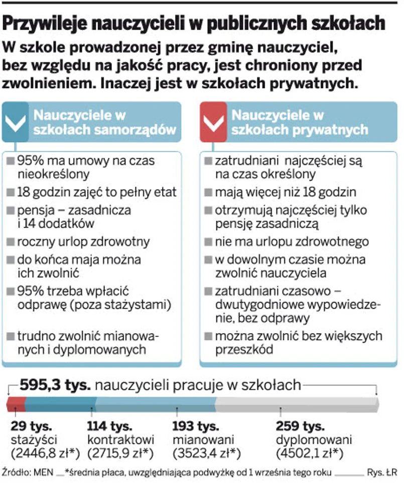– W ostatnich 10 latach mamy o 30 proc. mniej uczniów, a nauczycieli i szkół wciąż jest tyle samo – mówi Tadeusz Kołacz. Wskazuje, że trudno jest utrzymywać zatrudnienie na takim samym poziomie, jeśli np. z czterech oddziałów uczniów pierwszej klasy pozostają tylko dwa. Za takim działaniem przemawia też to, że gminy otrzymują subwencje oświatową z budżetu państwa w przeliczeniu na liczbę uczniów, a nie nauczycieli. W tym roku wyniesie ona 35 mld zł.