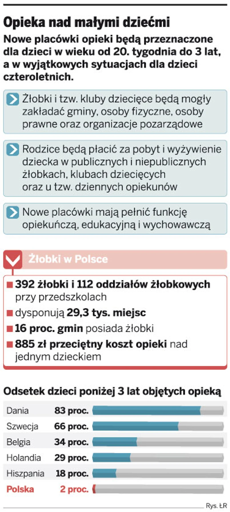 Propozycje zmian, które trafiły do konsultacji, a mają wejść w życie trzy miesiące od daty uchwalenia, likwidują więc najważniejszą barierę, która w tej chwili hamuje powstawanie żłobków. Nie będą już zakładami opieki zdrowotnej. Obecnie każdy żłobek musi spełniać takie same warunki budowlane, sanitarne czy zatrudniać osoby z wykształceniem medycznym, jak np. szpital.