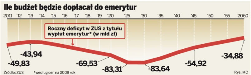 A z najnowszej przygotowanej przez ZUS prognozy wpływów i wydatków funduszu emerytalnego do 2060 roku wynika, że tak czy inaczej ubezpieczonych i emerytów w ciągu najbliższych 20 lat czekają ciężkie chwile. W ZUS, który takie prognozy przygotowuje raz na trzy lata, będzie brakować coraz więcej pieniędzy na wypłatę emerytur. W 2011 roku deficyt funduszu emerytalnego wyniesie 49,8 mld zł i będzie rósł, aby w 2030 roku osiągnąć rekordową kwotę ponad 83 mld zł (w cenach przeliczonych na 2009 rok).